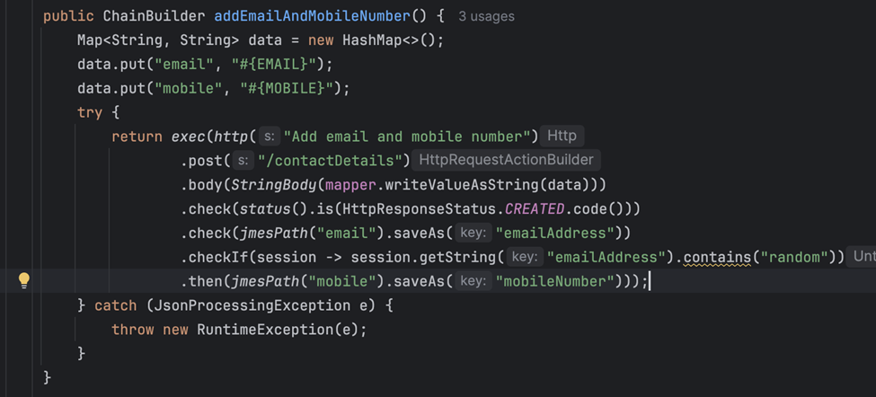 We have saved two variables email and mobile inside the session.We can access these stored variables using session.getString(“email”) and session.getString(“mobile”) or using gatling dsl “#{email}” and “#{mobile}” .
